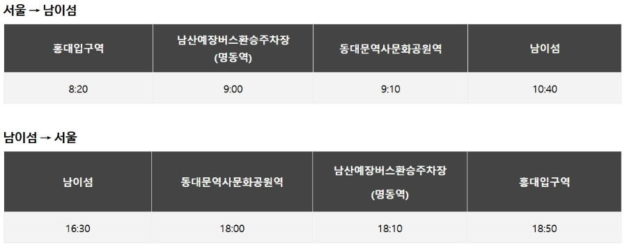 ※ 서울 ↔ 남이섬 직행버스 매일 운행 (왕복)