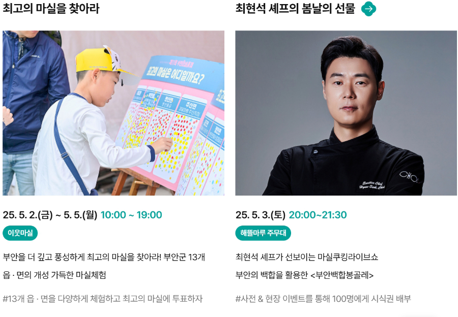 - 축제 기간 중 요일별로 프로그램이 다르므로, 홈페이지나 부안군청 공지 확인하세요.