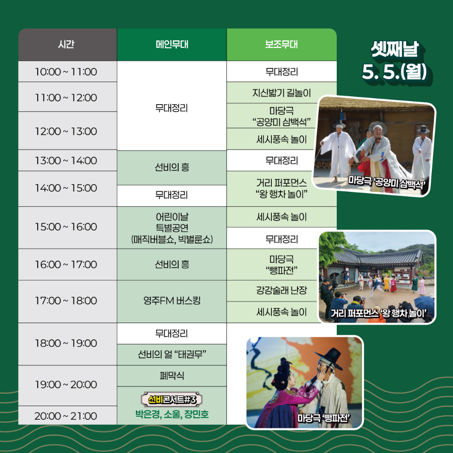 - 마당극 상설 공연: 영주천지밥, 뺑파전, 눙보밥 등