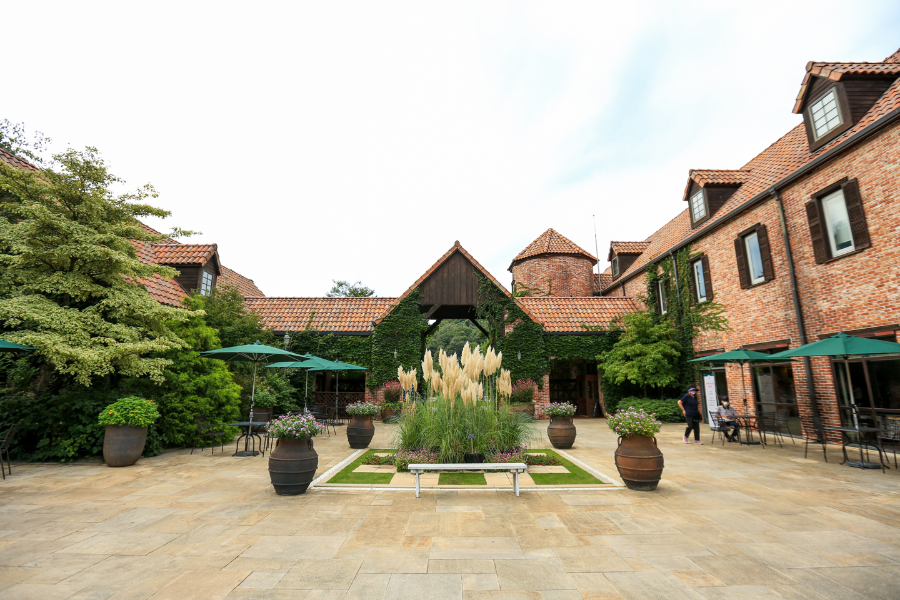 입구에 들어서자마자 유럽 감성이 물씬 풍기는 정원이 펼쳐집니다. 이탈리아 토스카나 지방의 고풍스러운 분위기를 담아낸 건축물과 어우러진 풍경이 정말 인상적이에요. 인생샷을 남기기에 딱 좋은 곳이죠!