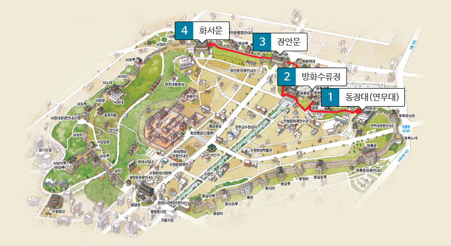 - 지하철: 1호선 수원역 하차 → 버스 11, 13, 36번 이용 → ‘화성행궁’ 하차